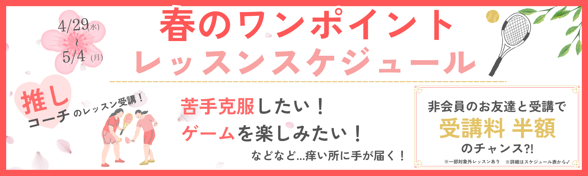 春季ワンポイントレッスン (春の短期集中レッスン) 期間:4/29(水・祝)~ 5/3(日・祝) 苦手克服から各種ショット強化、基礎固め…