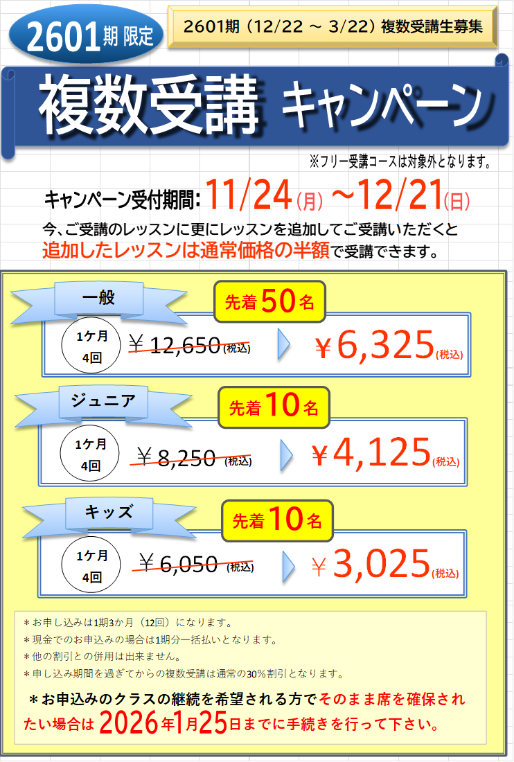 ※お申し込みのクラスの継続をして席を確保される場合は、2026年1月25日(日)までにフロントで手続きを行ってください。