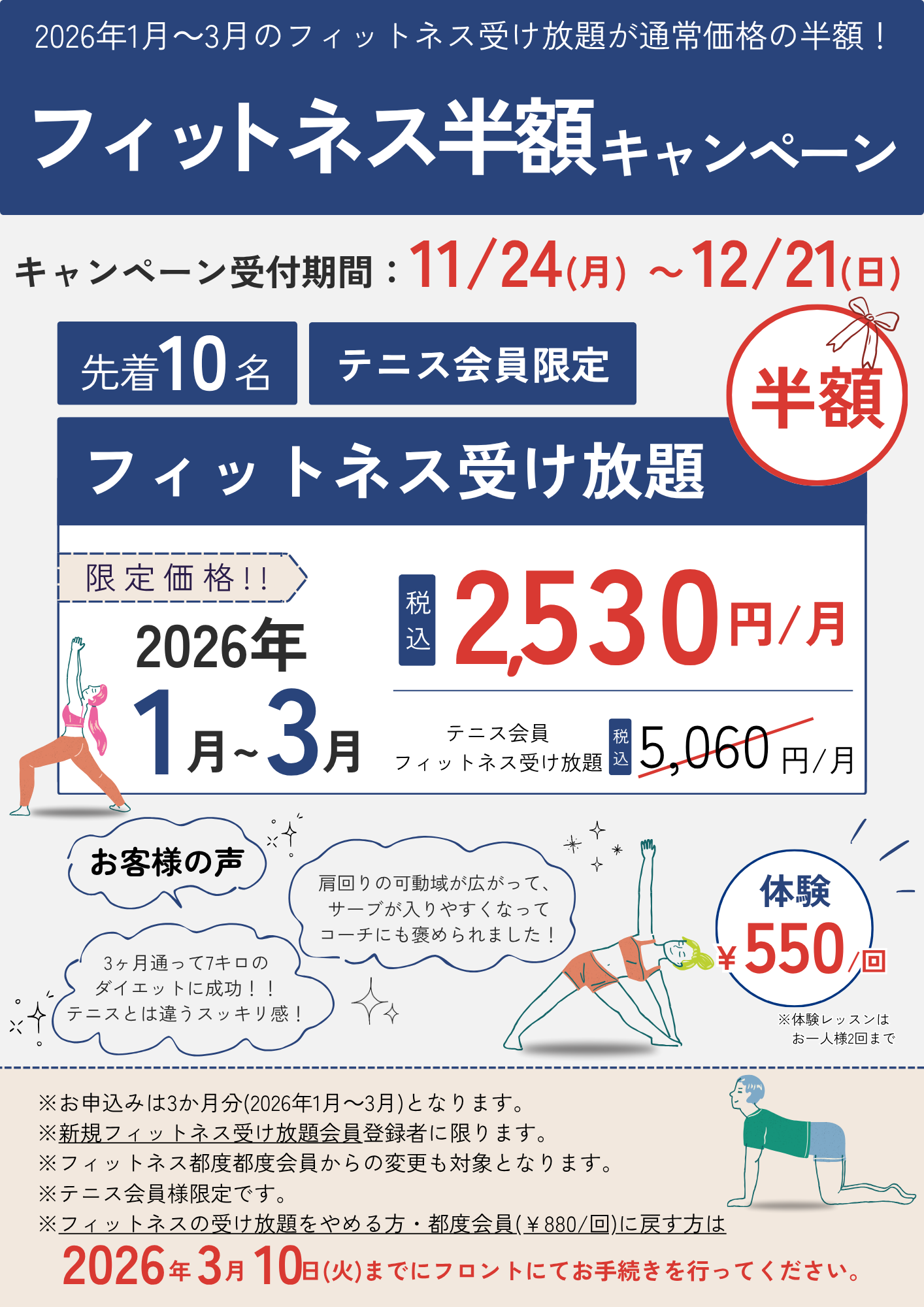 2026年1月~3月限定! フィットネス受け放題半額キャンペーン!