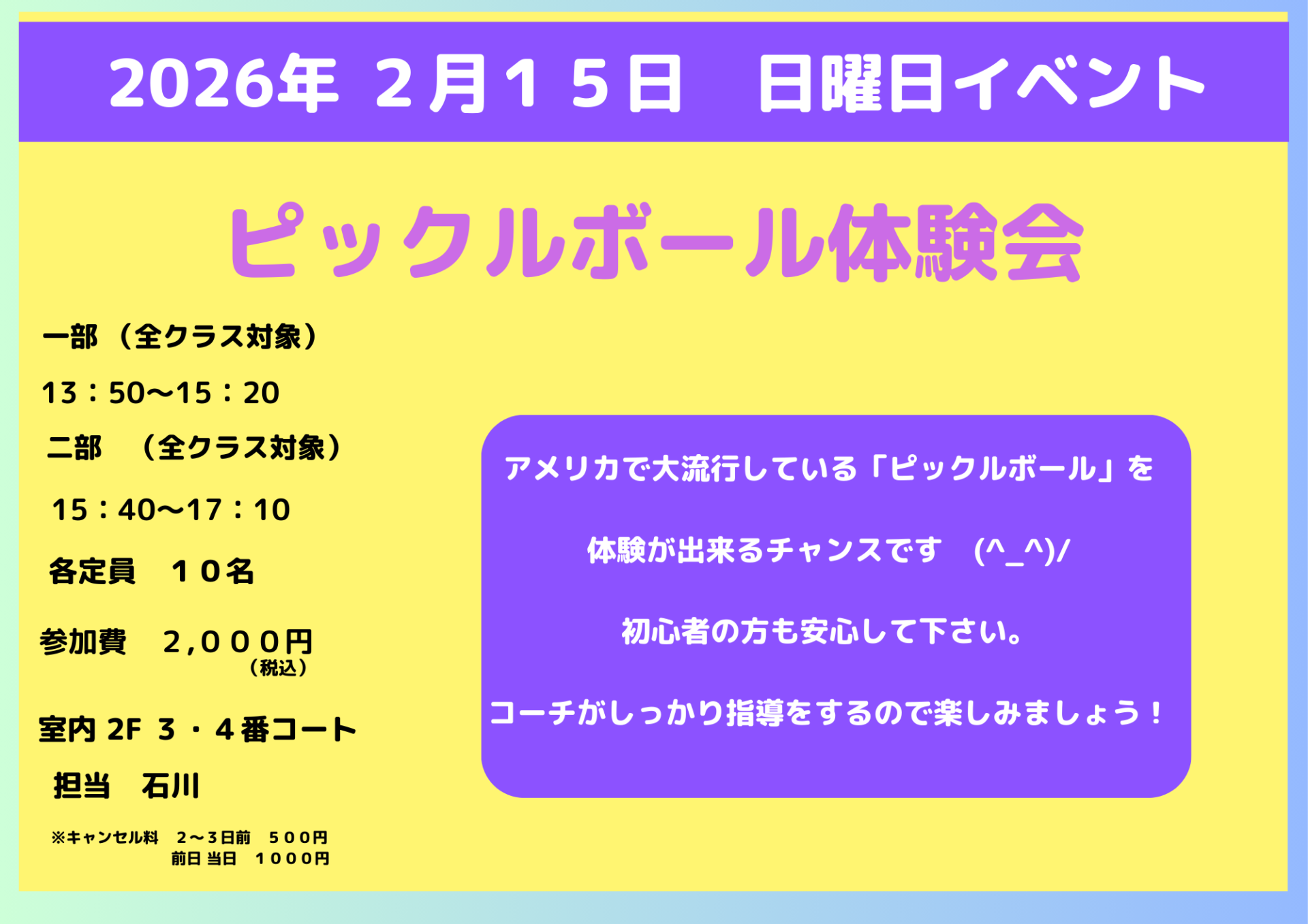 キャンセル料金:2~3日前500円、前日・当日1000円